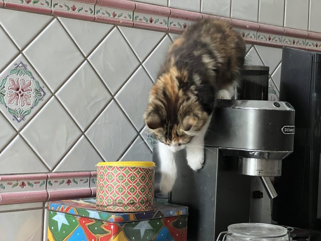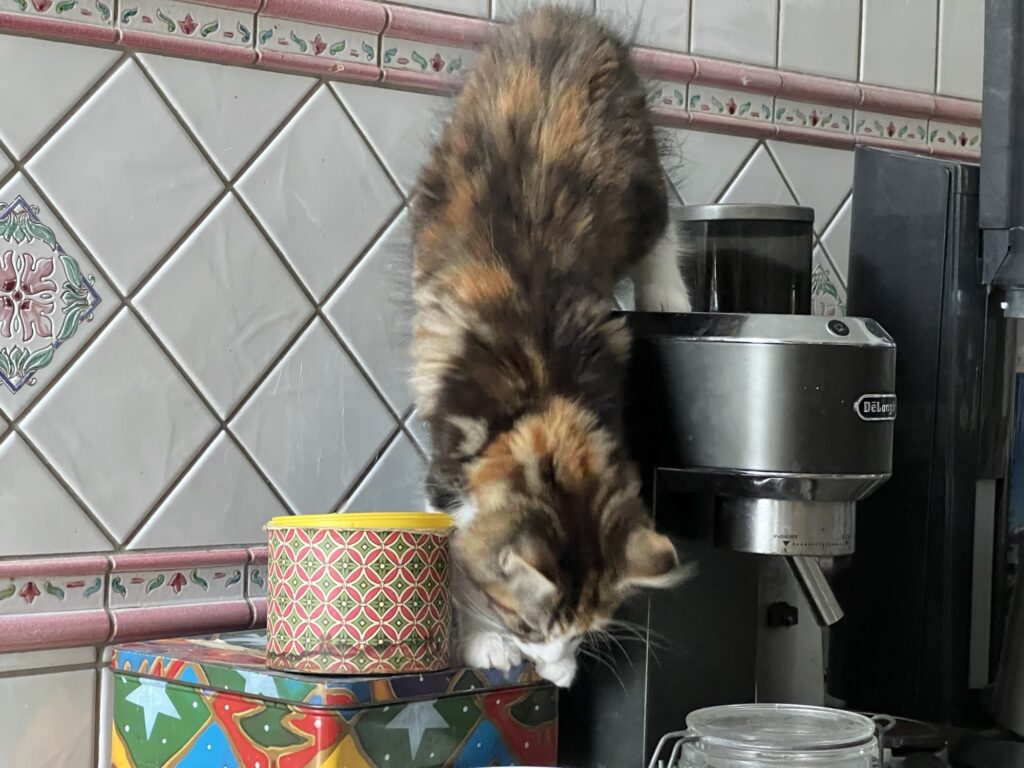 Hunger ist die größte Antriebskraft. Eigentlich für alles. Wieder mal eindrucksvoll zu sehen. Bei unserem Baby Coco. Sie ist auf Nahrungssuche. Überall. Erforscht dafür neue, ihr unbekannte Wege. Auch über den Espresso-Automaten. Und der Weg. Ist tatsächlich ein guter. Denn er führt direkt: Zur Dose mit den Super-Leckerlis. Leider, leider: Verschlossen.