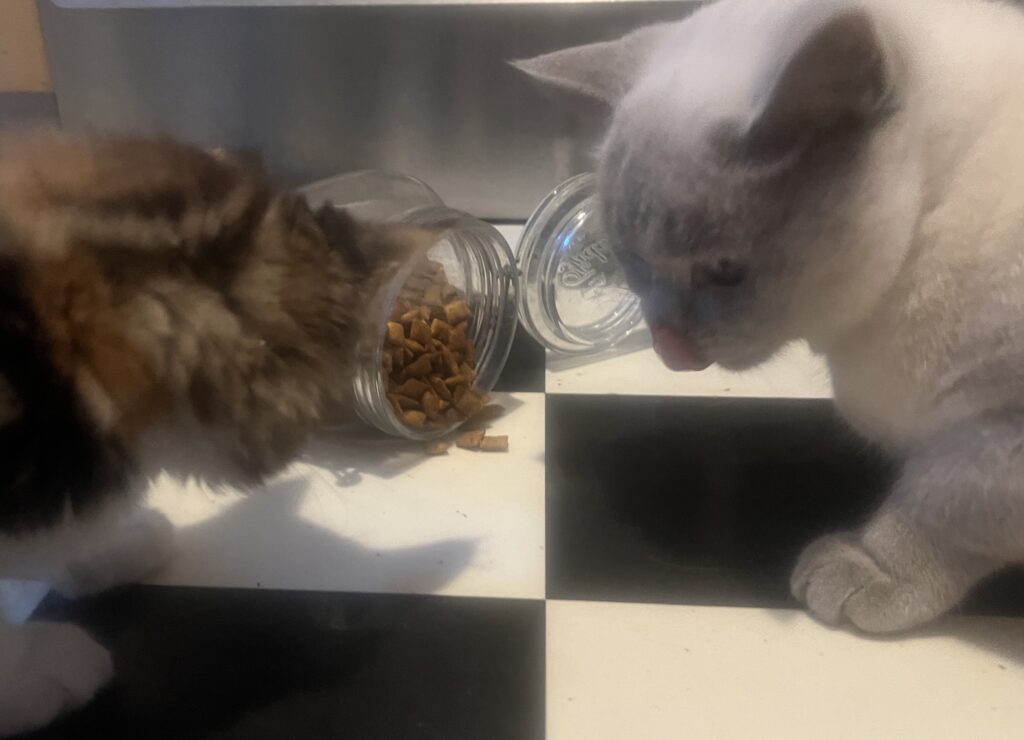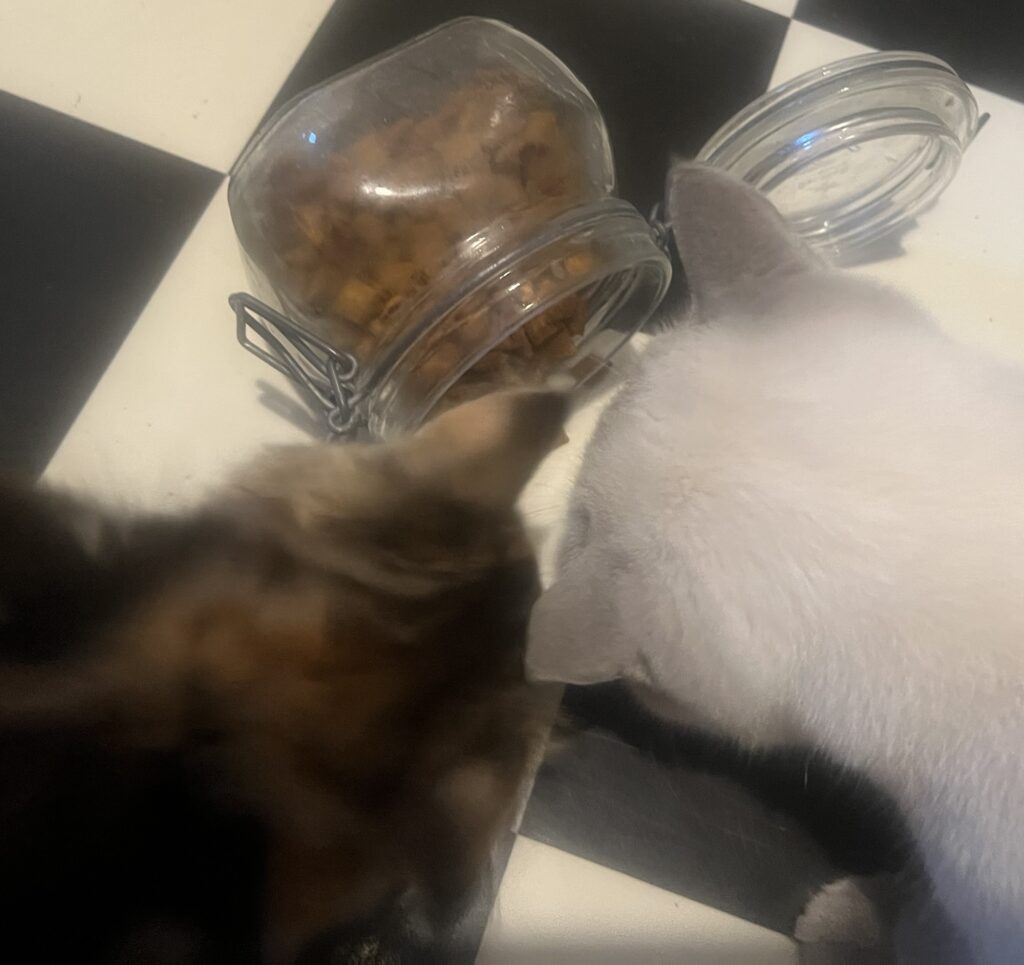 Zurück zu Coco. Deren Auge wieder glänzt, deren Nüstern wieder frei sind. Nach der Tierarzt-Spritze gestern. Action also. Sie ist schlau. Wischt mit der Pfote gegen das Leckerli-Glas. Das dröhnend auf den Boden kracht., Und sich entlädt. Festschmaus also. Für sie. Aber auch für mich. Dank. An. Sie.