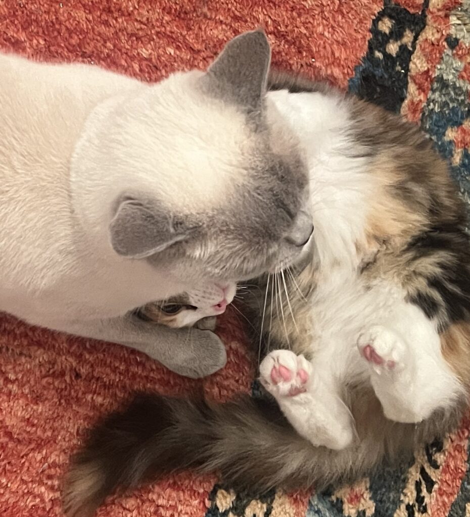 Und ich konstatiere, cool: An der Aussage ist was dran. Aber! Das große Aber! Natürlich können wir – obwohl total unabhängig – Zuneigung zeigen: Zu unseren Artgenossen. Und so liegen Coco und ich da. Umarmen uns. Spüren den Herzschlag des anderen. Entspannen uns. Chillen. Denn heute: Ist. Auch sonst so. Ein. Guter. Tag.