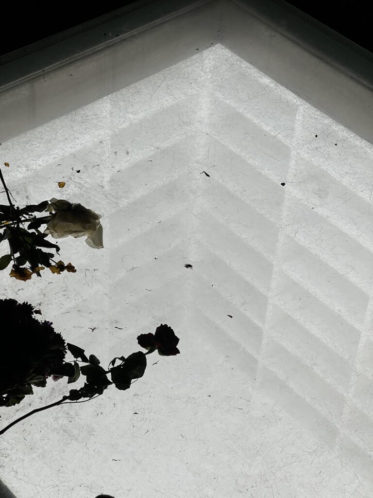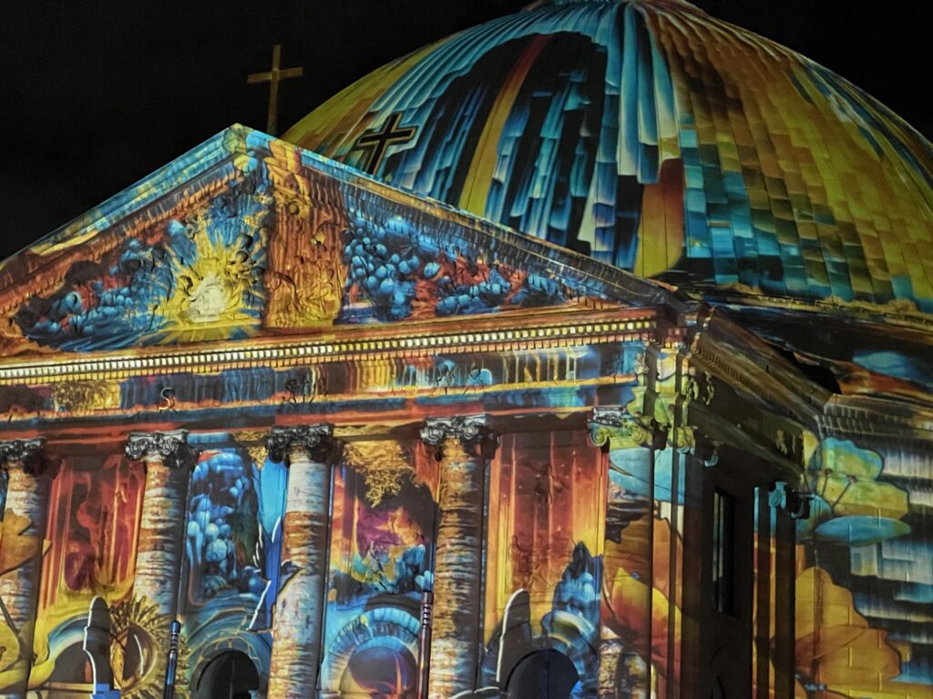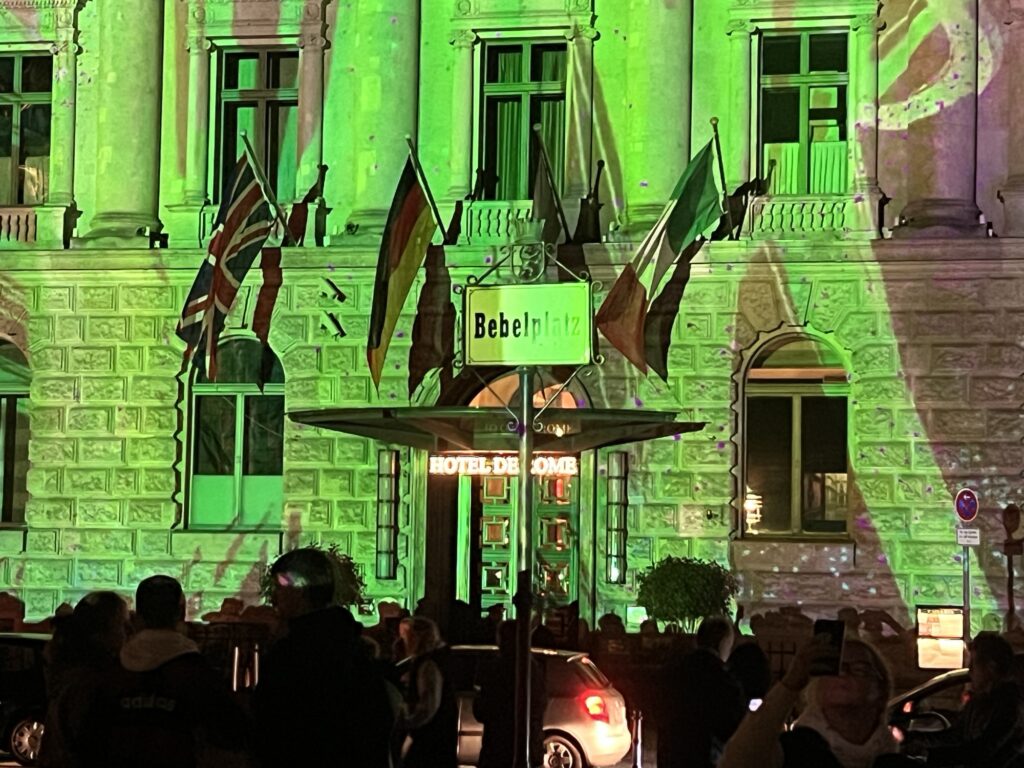 Trifft auch meine Bruna. Anderes Thema. Sie war auf dem Bebelplatz in Berlin. Beim Festival of Lights . Da werden die umliegenden Gebäude mehr oder weniger kitschig-bunt illuminiert – und Bässe wummern. Mitten auf dem Platz im Boden eingelassen ein weiß strahlender Ort, über den die Menschenmassen promenieren.