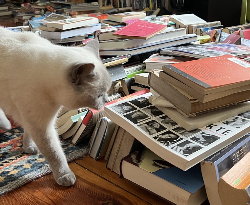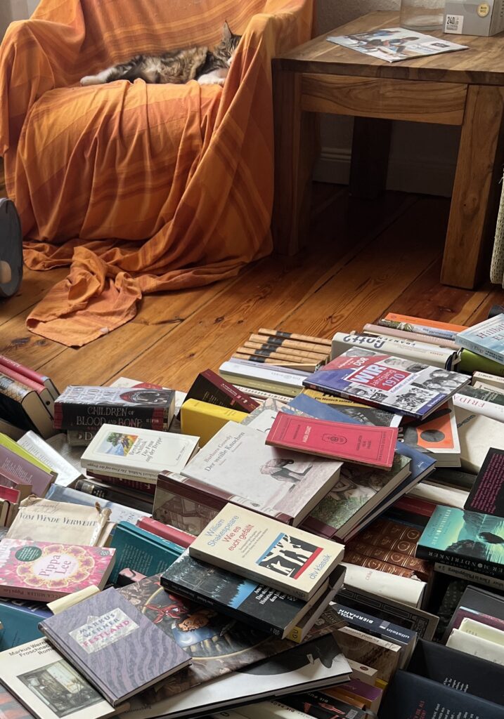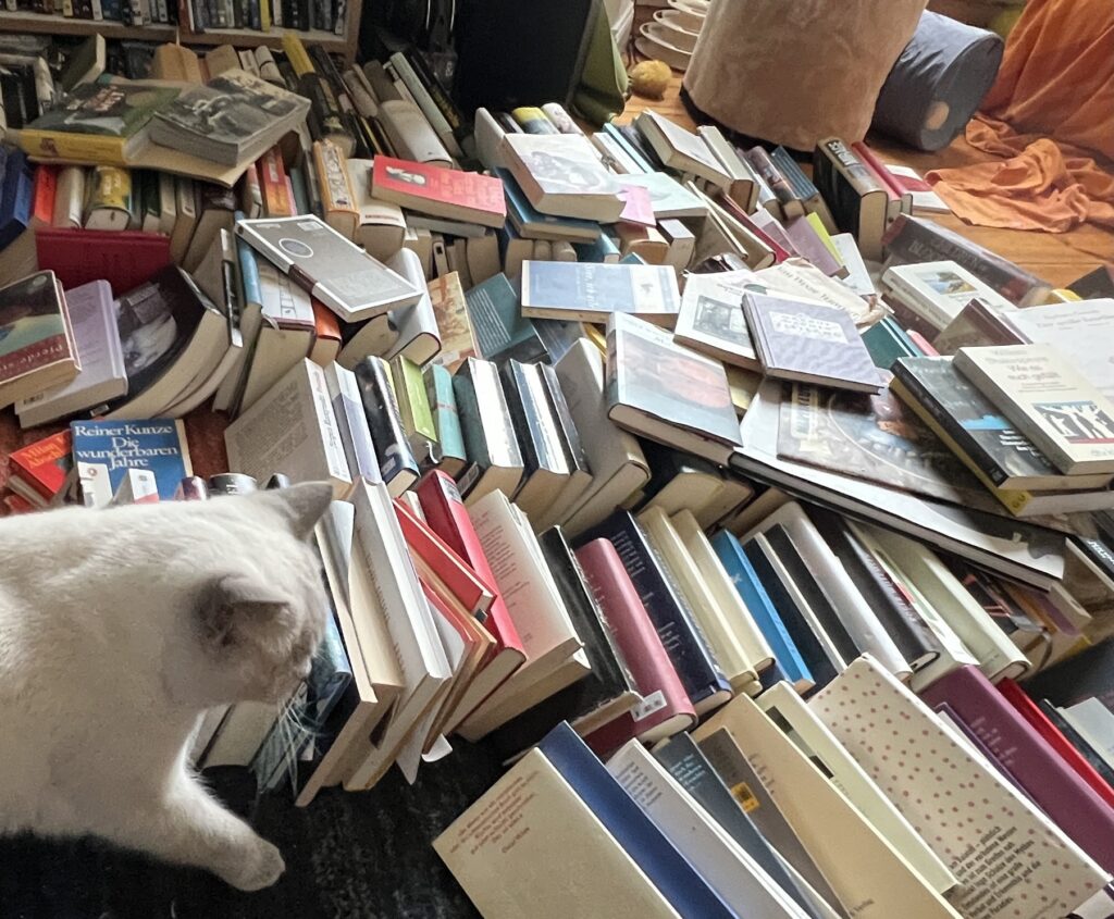 Auch Kater können allergisch sein. Merke ich so – niesend. Als sich der Staub langsam legt, erkenne ich mein Revier nicht wieder: Bücher. Hunderte Bücher. Auf dem Teppich, auf den Stühlen, dem Sofa, der Bank, den Tisch – überall. Laura hat sie aus dem Regal geholt. Abgestaubt. Weil sie unberührt seit Jahrzehnten dort lagerten. Also als Staubfänger mit intellektuellem Touch fungierten. Wie Felix ätzt.