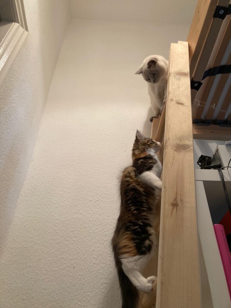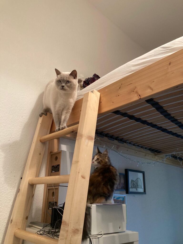 Es gibt auch in meinem Revier verbotene Zonen. Beispielsweise die Künstler-Kammer. Hinter der Küche. Das geheiligte Zimmer Lauras. Mit vielen Pinseln, Farbdöschen und Stiften. Die so nice durch die Gegend fliegen. Wenn man sie leicht touchiert. Und dann gibt es hier noch eine Leiter – zugleich Kratzbaum und Catwalk. Alles nice also.