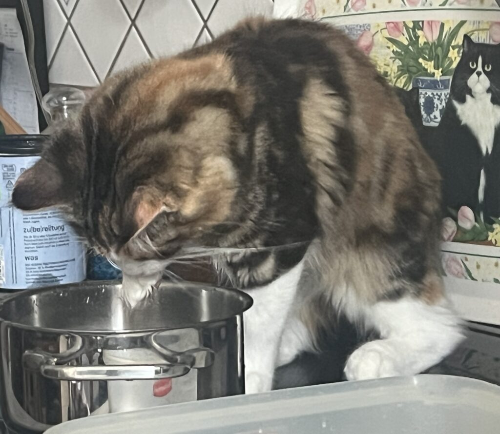 Wenn nur Coco nicht wäre. Die ihre nassen Pfoten schüttelt. Und dann – dann drückt sie den Topf per Nase Richtung Abgrund. Der Topf stürzt. Und überall verteilt sich das Wasser, auf dem Boden, auf meiner potenziellen Landefläche. Alles nass. Eklig. Wo ich landen könnte? No way. Sagt der trockene Hauptstadtkater. Der über euch wacht. Und jetzt: Chillt, Leute.