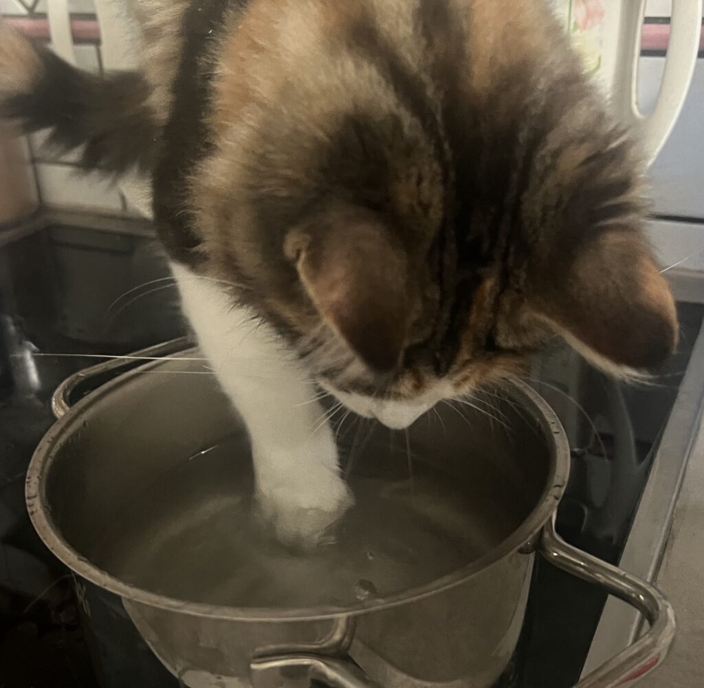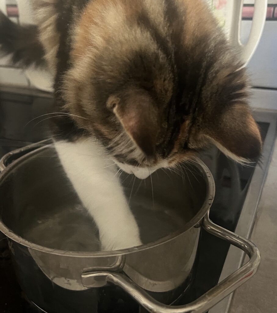 Coco. Liebt. Wasser. Was zeigt, wie degeneriert ihre Rasse ist. Main Coone eben, kein Britisch Kurzhaar wie ich. Heute wieder: Sitzt sie auf dem edlen Herd vor dem Topf mit dem gerade abgekühlten Wasser, in dem die Eier badeten. Und taucht dann ihre Pfoten ein. Erst die rechte, dann die linke. Wieder und wieder. Und spritzt dann mit dem Wasser rum. Ohne Ende. Und ich? Fliehe.