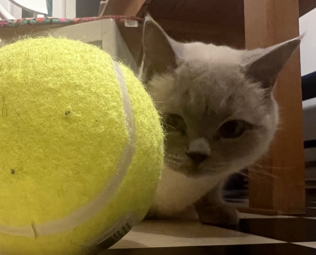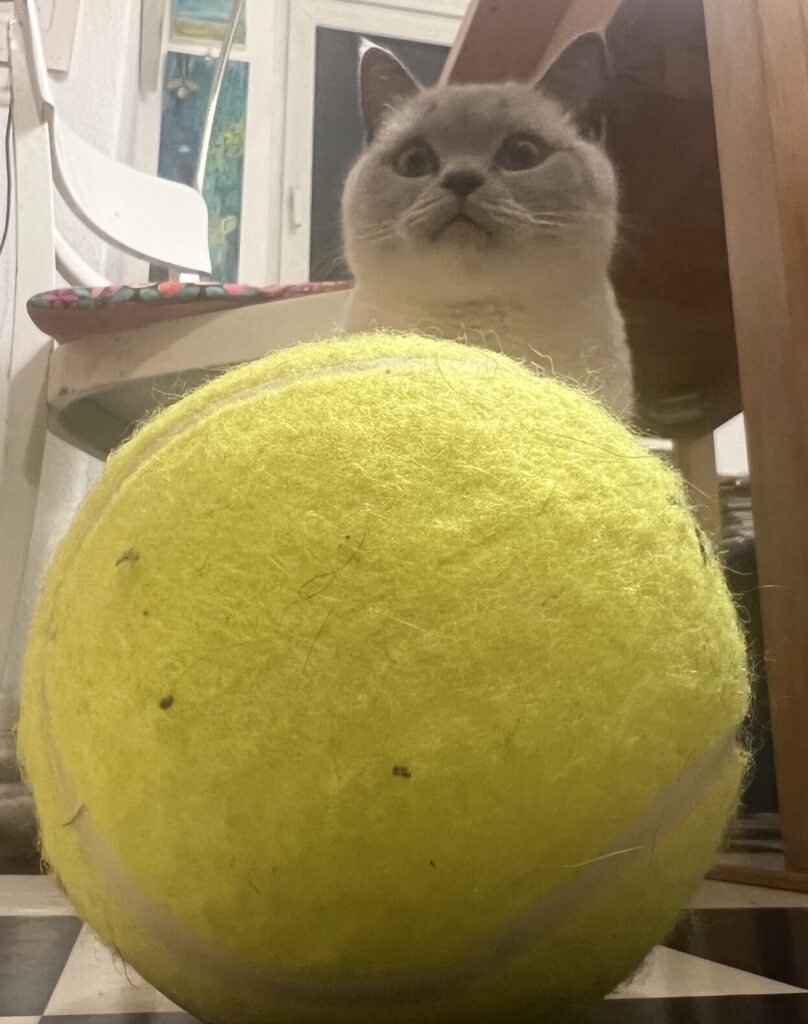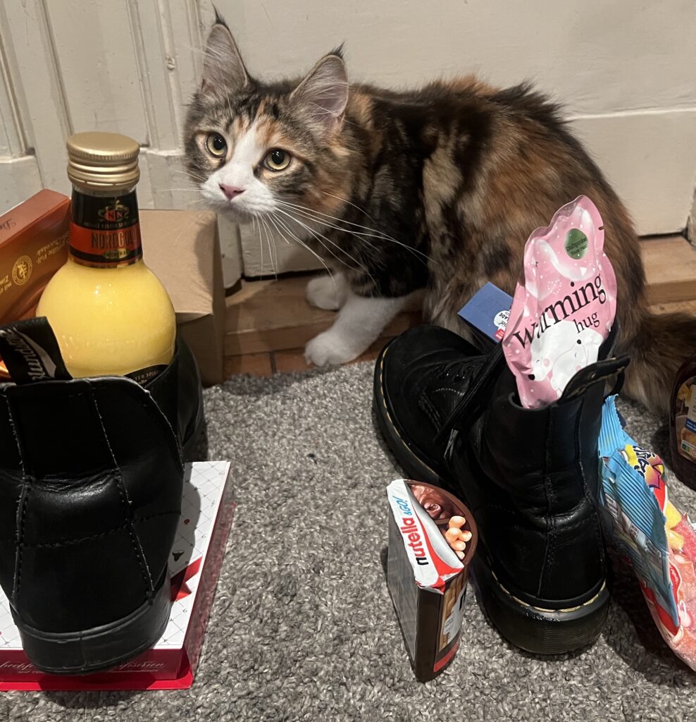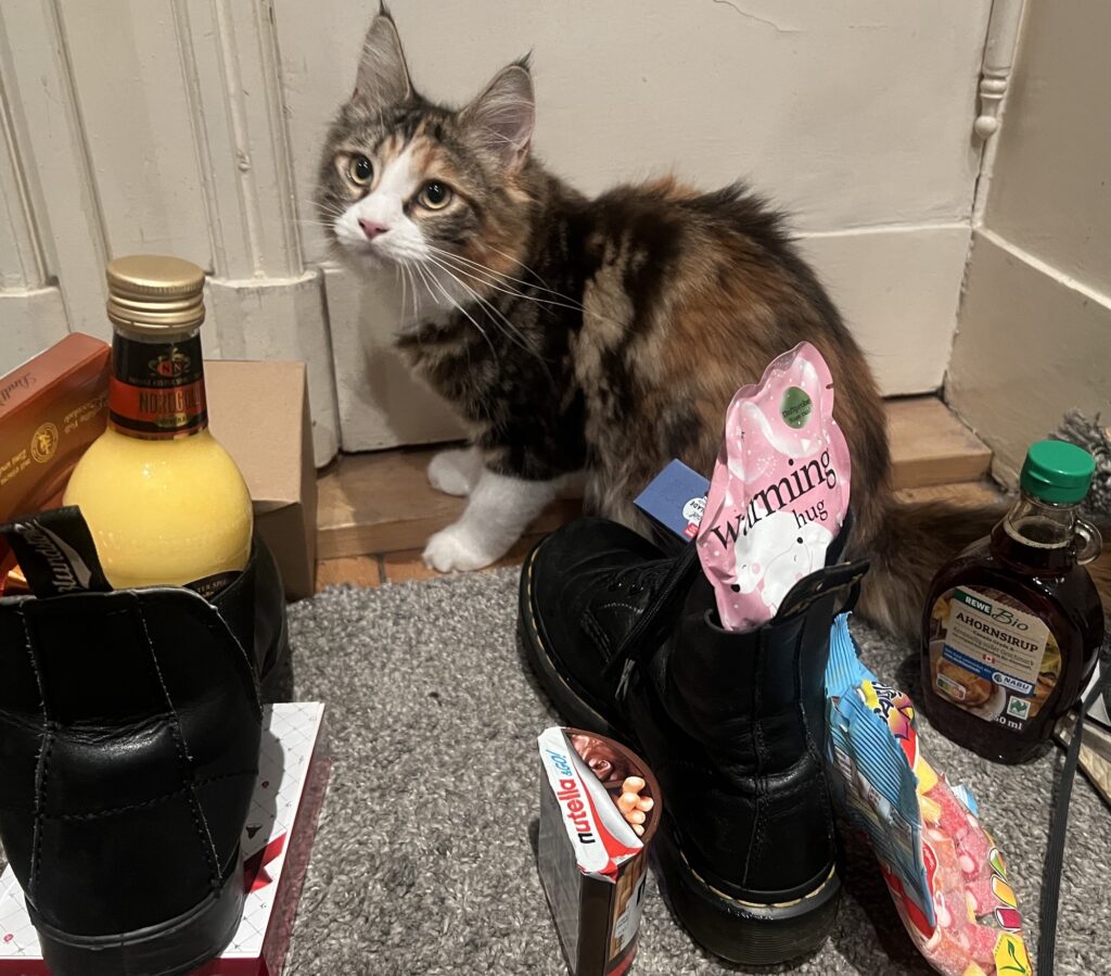 Aber doch: Eigentlich alles unterhaltsam und lustig, weil unfassbar – aus Sicht von Januar 2017. Aber es ist eben Dezember 2025. Und real. Was also tun? Gegen Frust? Ich spiele einfach mal Ball. Der ist mein Freund. Und: Heute ist Nikolaus. Nice, weil Schoko, Flaschen, Mandarinen und Kekse in stinkenden Schuhen auf dem Boden stehen. Und durch die Gegend gewirbelt werden können. Lernt auch gerade Coco.