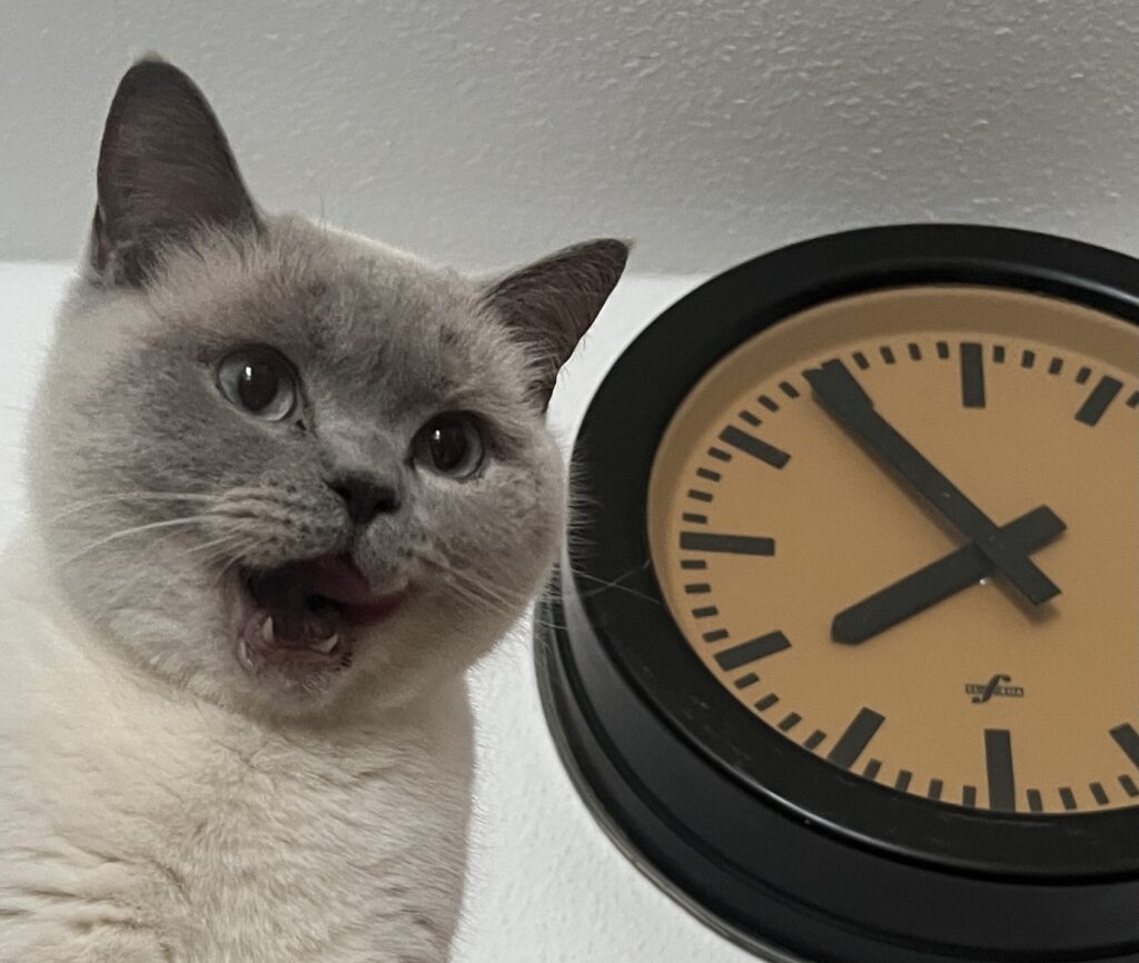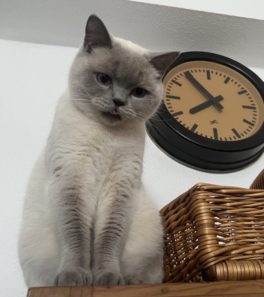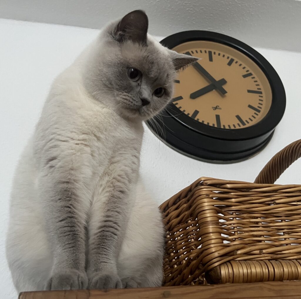 Denn die Zeit fließt weiter. An mir vorbei. Unbegreiflich. Für mein kleines Hirn. Kaum an Zukunft gedacht, ist Zukunft Vergangenheit und ihre Gegenwart nicht erfasst. Denke ich so. Erneut schaudernd. Und ich würdige Menschen mit Zeit, die beispielsweise Teilzeit arbeiten – um mehr Zeit für Leben, Gegenwart, Menschen und Kater zu haben.