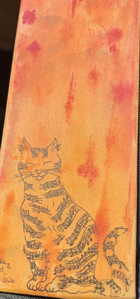 Dann sitzen sie alle zusammen – zu elft – am Tisch. Meine family und die vom Onkel meiner Alea aus Gießen. Weil die Oma meiner Bruna Geburtstag hat: 87. Meine beiden Mädels überreichen ihrer Oma Lina als Geschenk ein selbst gemaltes Porträt, das mich zeigt. Mit Fell aus Noten. Oma Lina ist voll begeistert.