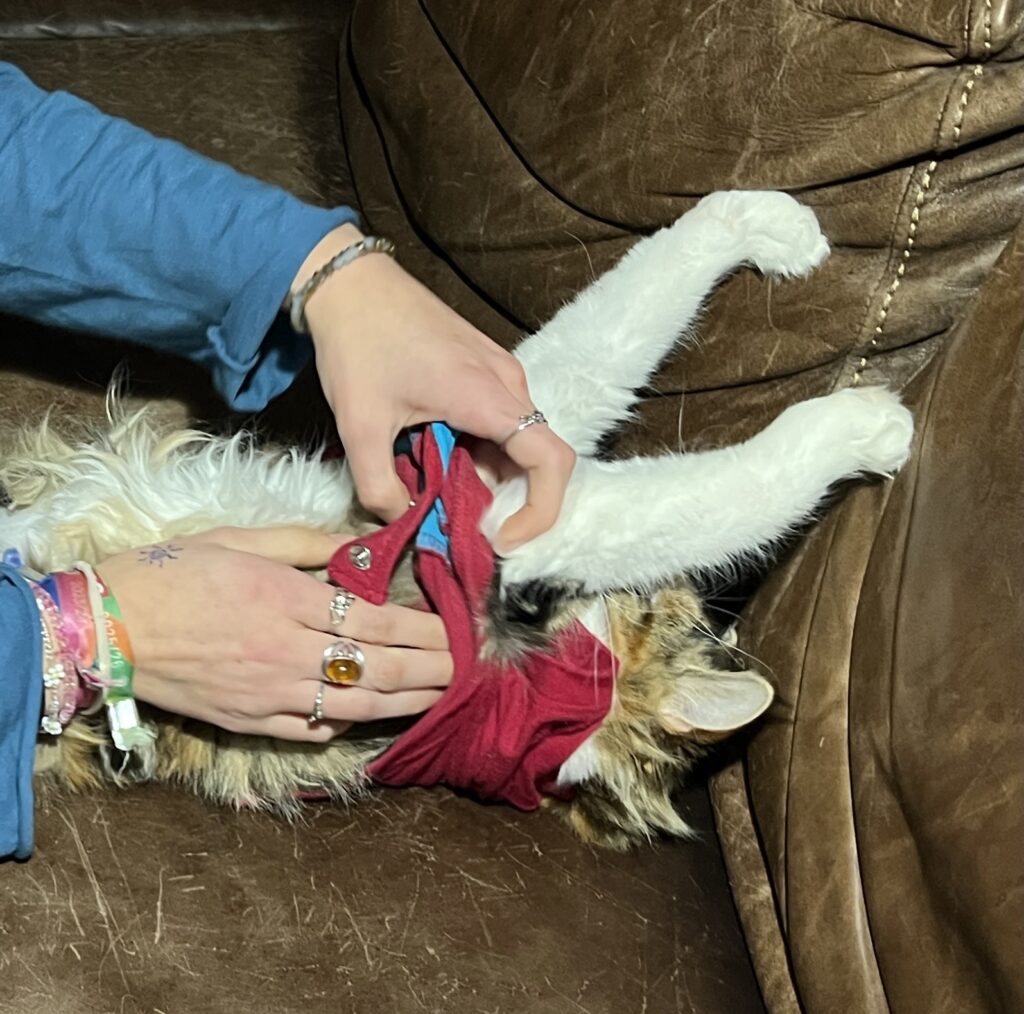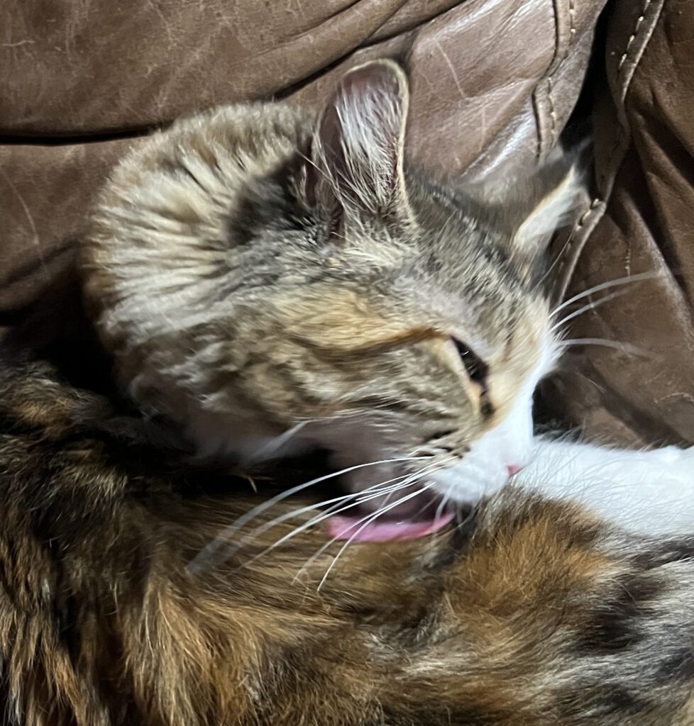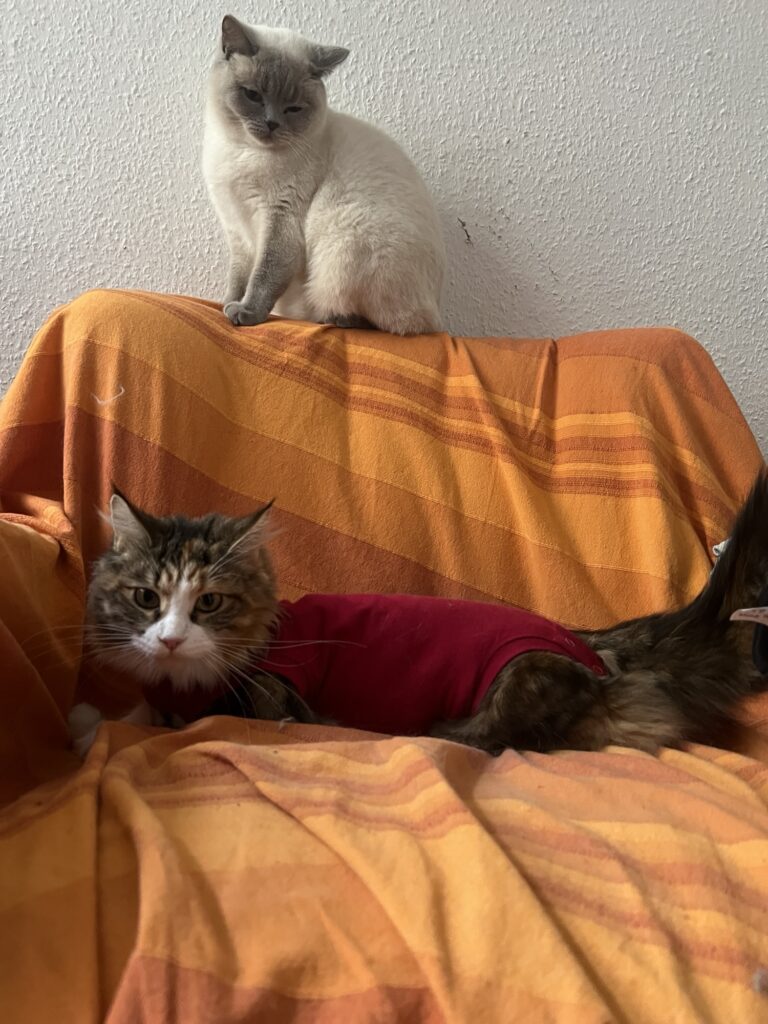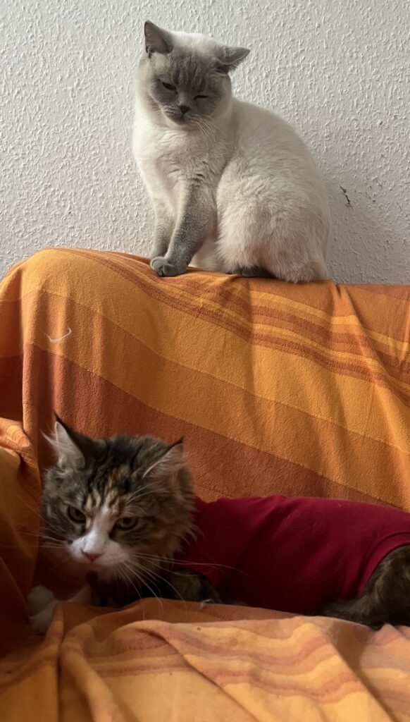 • Coco ist nach Eierstockvernichtung fast wieder die Alte: Springt auf mich. Leckt mein Ohr.