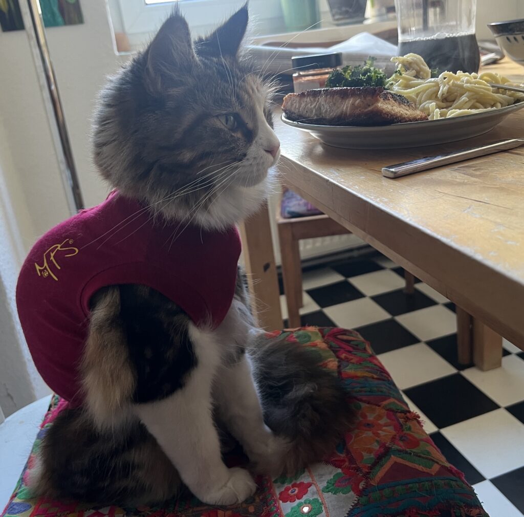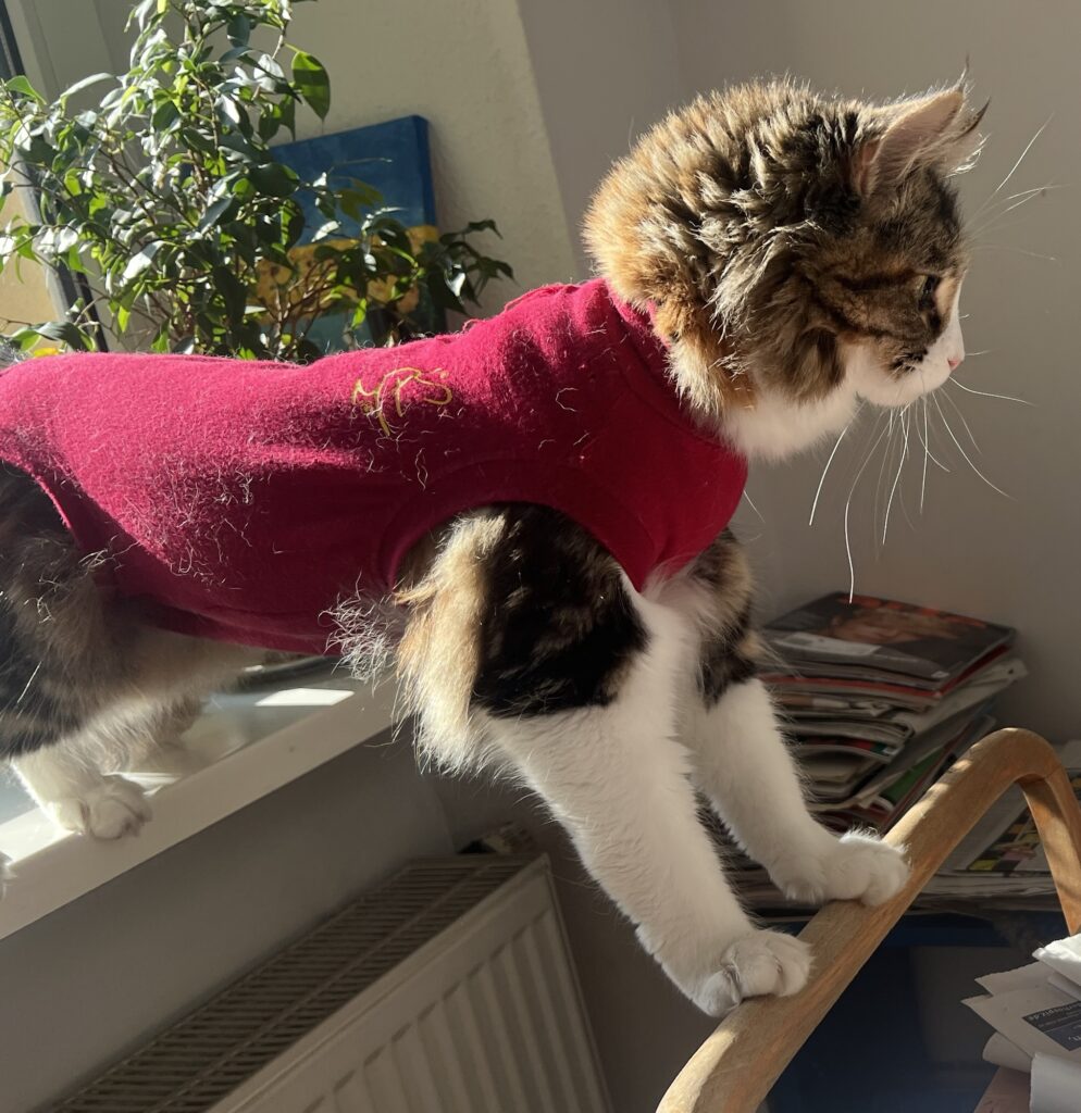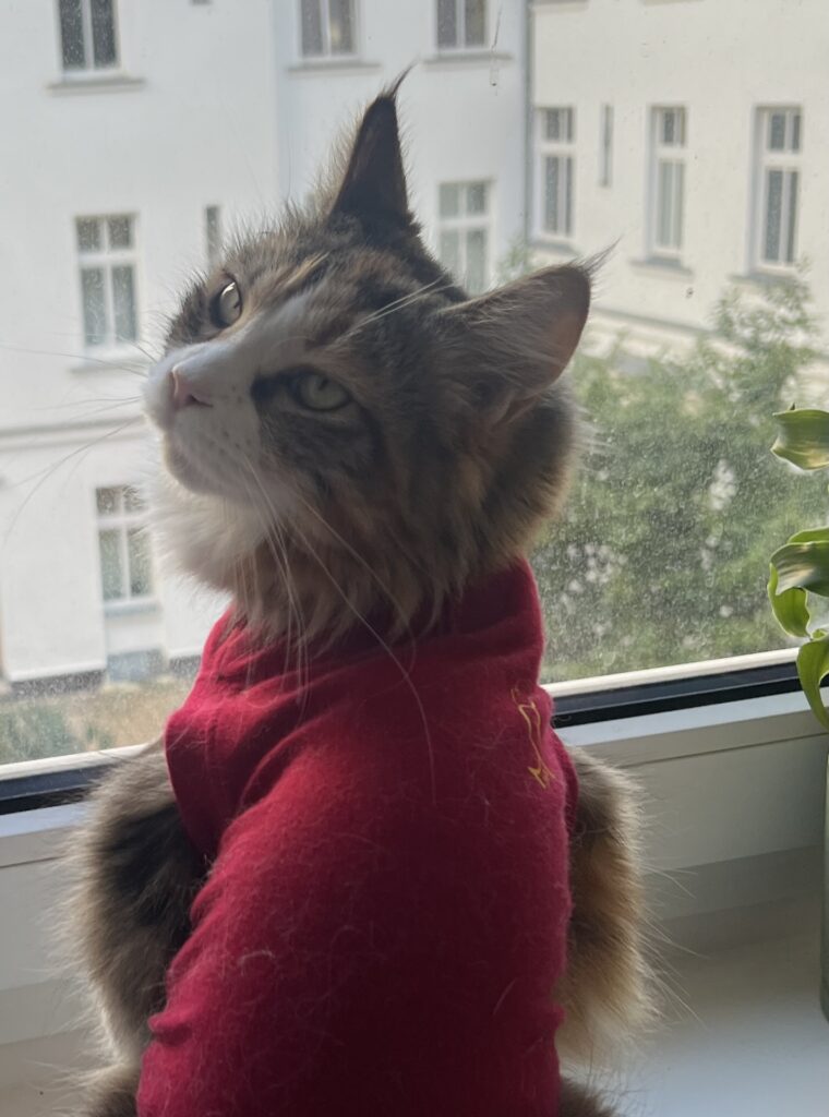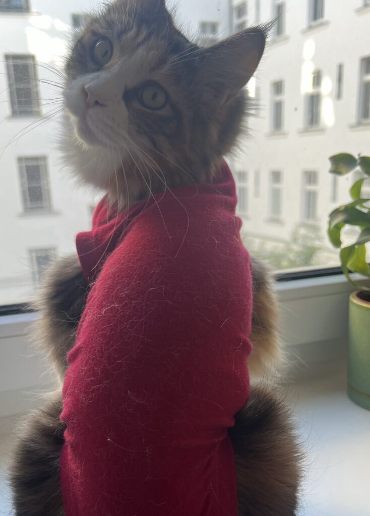 Coco steckt in einer Zwangsjacke. So schaut es zumindest aus, wenn sie stolz wie eh und je auf dem Küchentisch auf Felixens aufgestapeltem Zeitungsstapel posiert. In ihrem roten Body. Der sie nervt. Weil er Sprungkraft hemmt und einengt. Sie sich nicht richtig kratzen kann. Ihre Haarpracht sich nicht entfalten kann. Aber: Es muss eben sein. Behaupten meine Leute. Zum Schutz der OP-Wunde. Die nach der Eierstockvernichtung vernäht wurde.