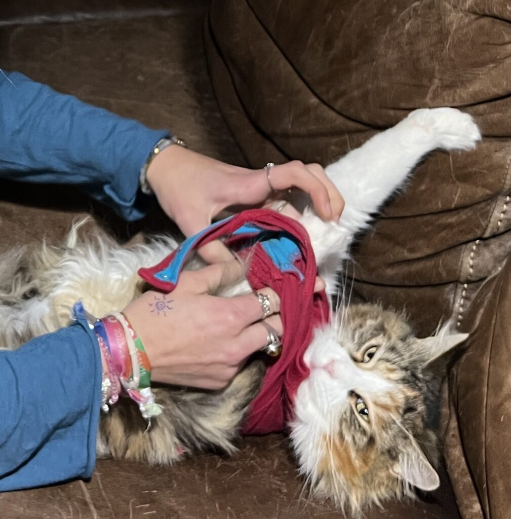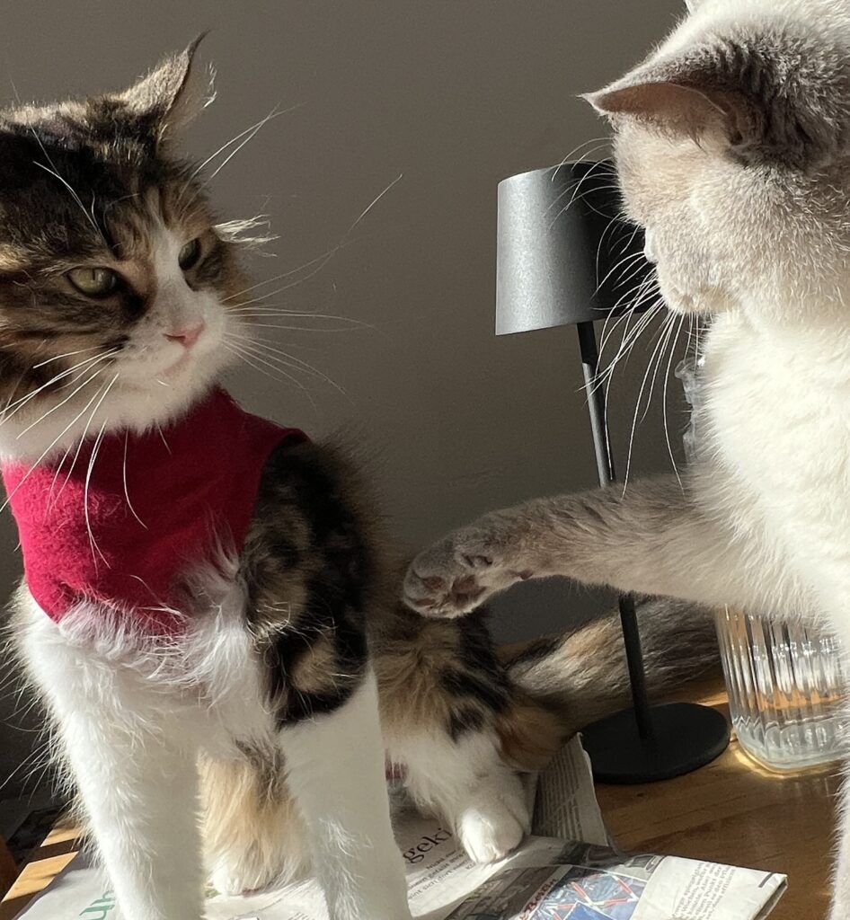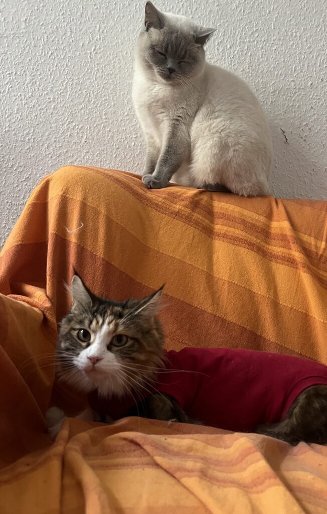 Coco steckt in einer Zwangsjacke. So schaut es zumindest aus, wenn sie stolz wie eh und je auf dem Küchentisch auf Felixens aufgestapeltem Zeitungsstapel posiert. In ihrem roten Body. Der sie nervt. Weil er Sprungkraft hemmt und einengt. Sie sich nicht richtig kratzen kann. Ihre Haarpracht sich nicht entfalten kann. Aber: Es muss eben sein. Behaupten meine Leute. Zum Schutz der OP-Wunde. Die nach der Eierstockvernichtung vernäht wurde.