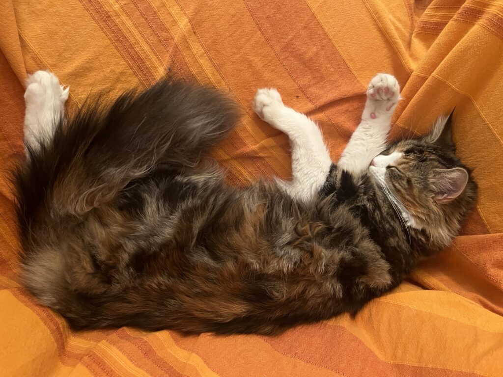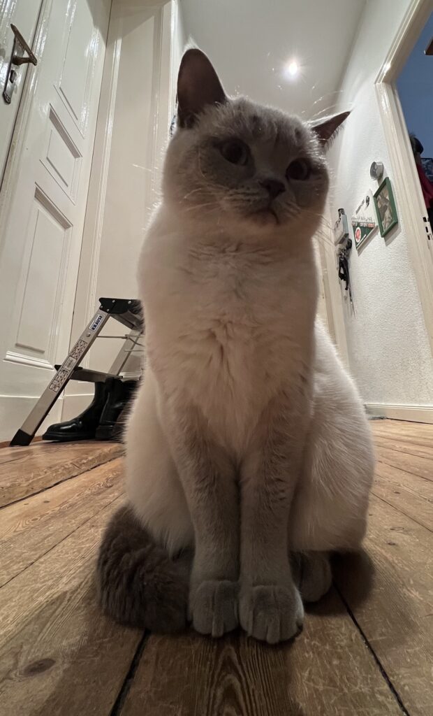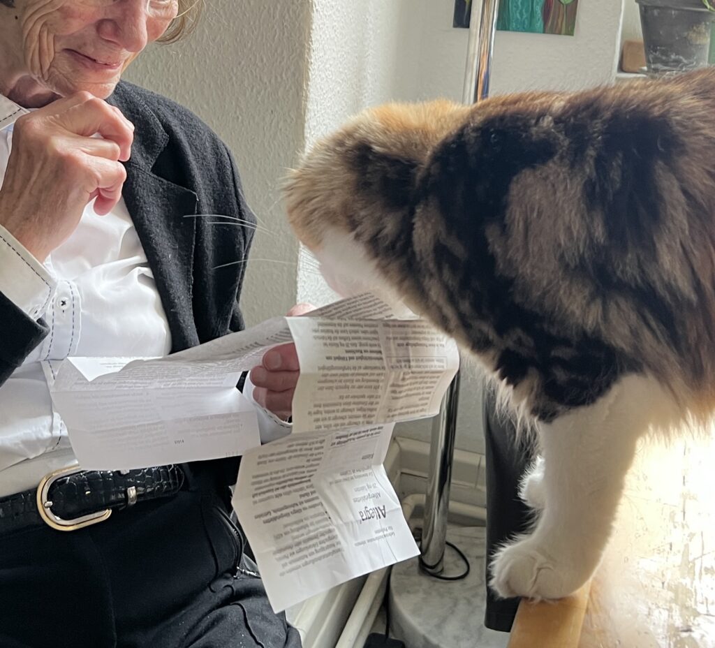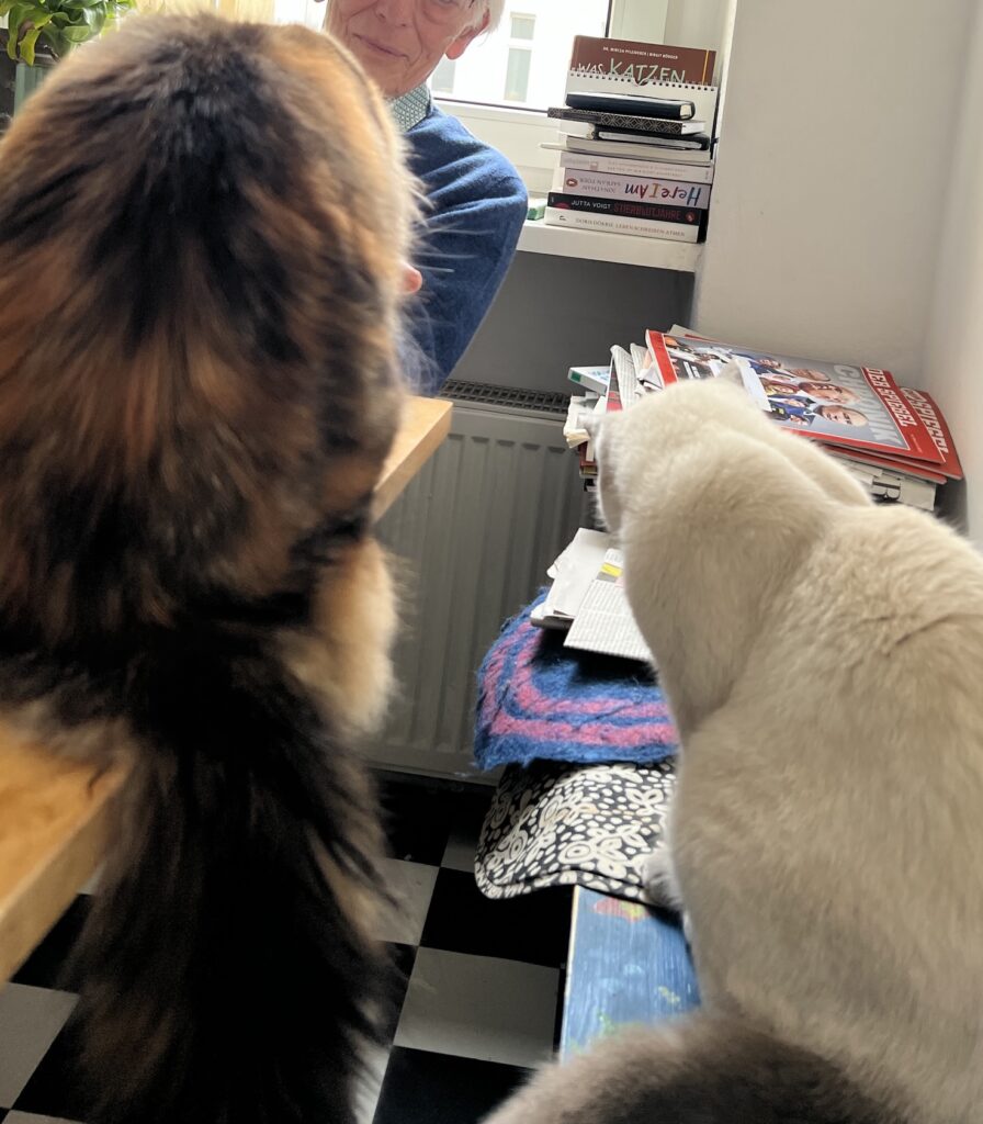 Kurz, mein Appell: Mensch, schaut auf eure Katzen. Und Kater. Ohne Entschleunigung keine Beschleunigung. Denke ich so. Und sehe neue Menschen in meinem Revier. Die Großeltern meiner Bruna, Volker und Lina. Old school sind sie. Haben Geduld. Mit uns und unseren Ängsten. Vor dem Fremden. Und wir – tasten uns langsam vor. Nähern uns an. Und springen dann. Als sie die Leckerli auspacken.