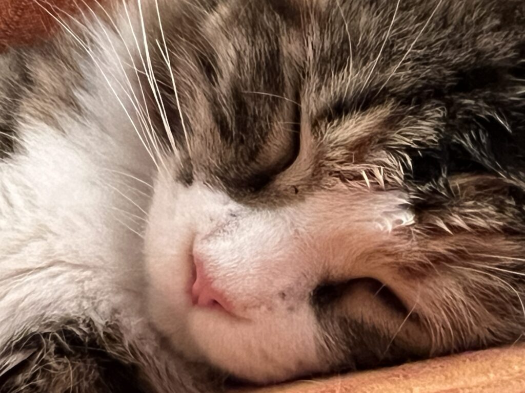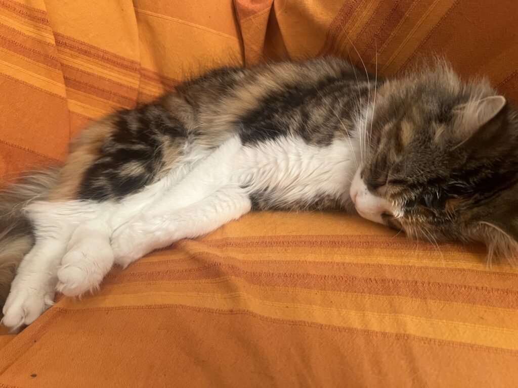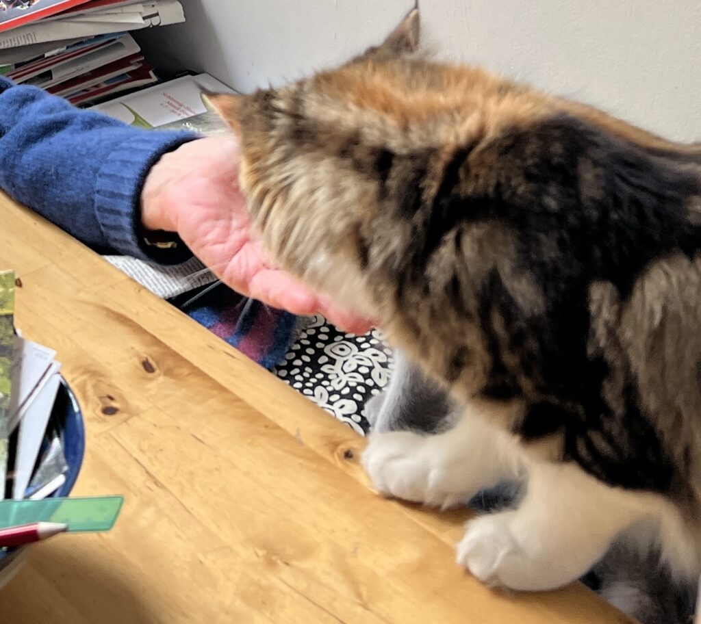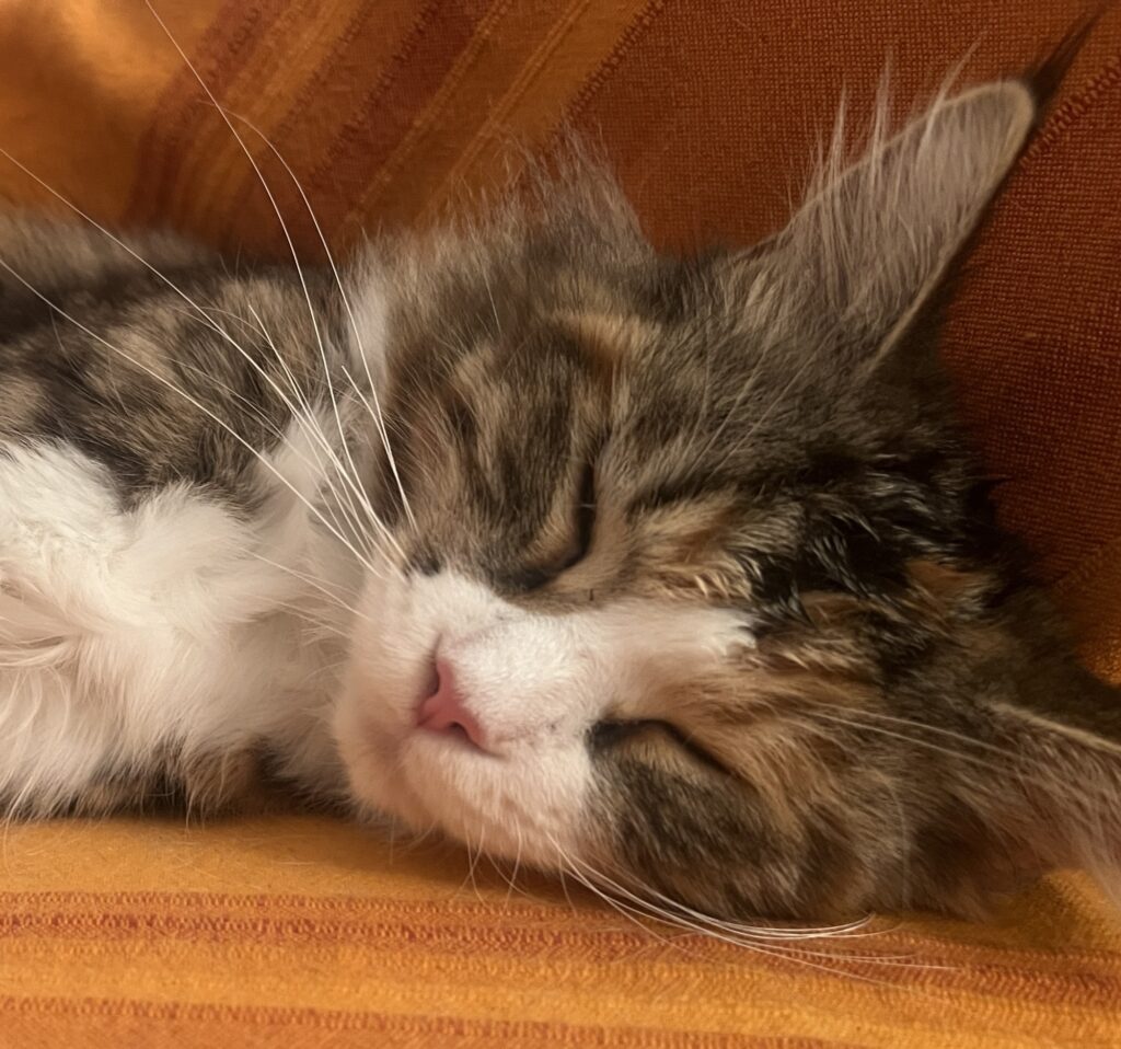 Kurz, mein Appell: Mensch, schaut auf eure Katzen. Und Kater. Ohne Entschleunigung keine Beschleunigung. Denke ich so. Und sehe neue Menschen in meinem Revier. Die Großeltern meiner Bruna, Volker und Lina. Old school sind sie. Haben Geduld. Mit uns und unseren Ängsten. Vor dem Fremden. Und wir – tasten uns langsam vor. Nähern uns an. Und springen dann. Als sie die Leckerli auspacken.