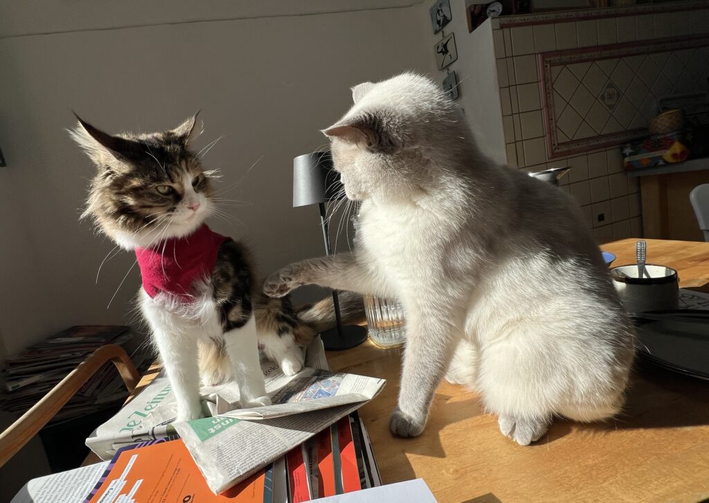 Doch: Genug gejammert, heute überwiegt tatsächlich die plus Aura. Weil: Krasse Sonne im Revier. Mein Pelz richtig nice erwärmt ist. Also: Chillfaktor zehn von zehn. Im Sonnenfleck auf den Zeitungen auf meinem Küchentisch. Und ja – es bleibt auch nice, als die ebenfalls durch die Sonne voll geflashte Coco zu mir hüpft. Und Körperkontakt sucht. Why not? Dann eben kämpfen. Macht. Voll. Spaß. In. Der. Sonne. Really.