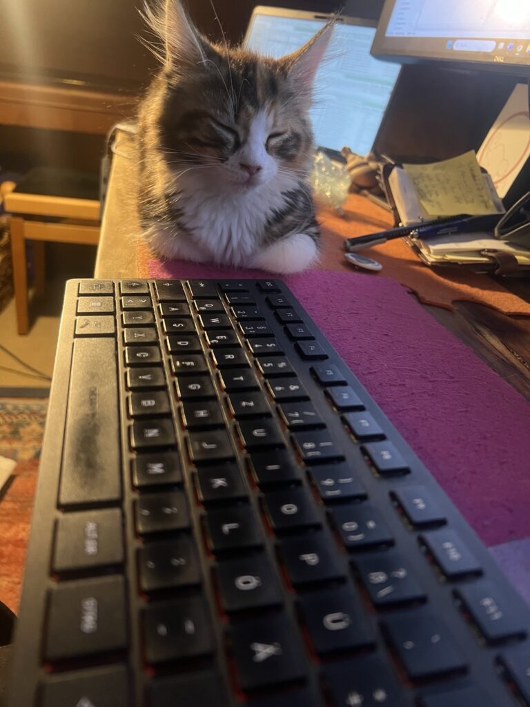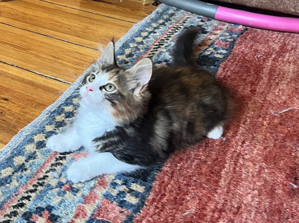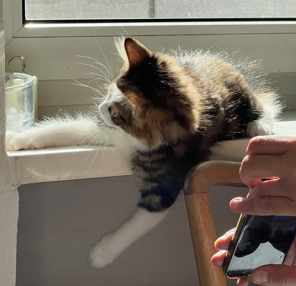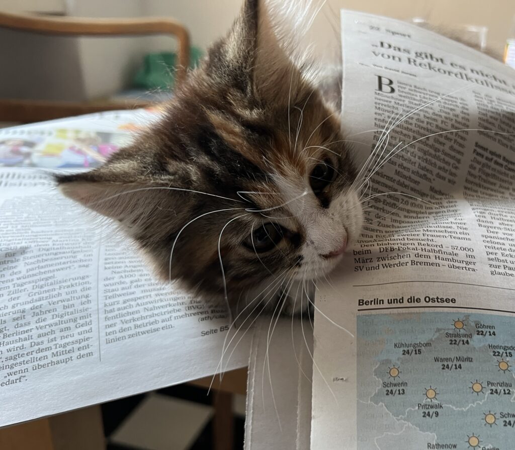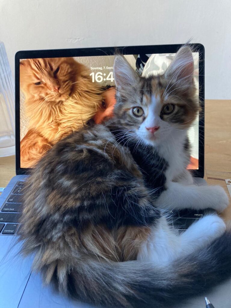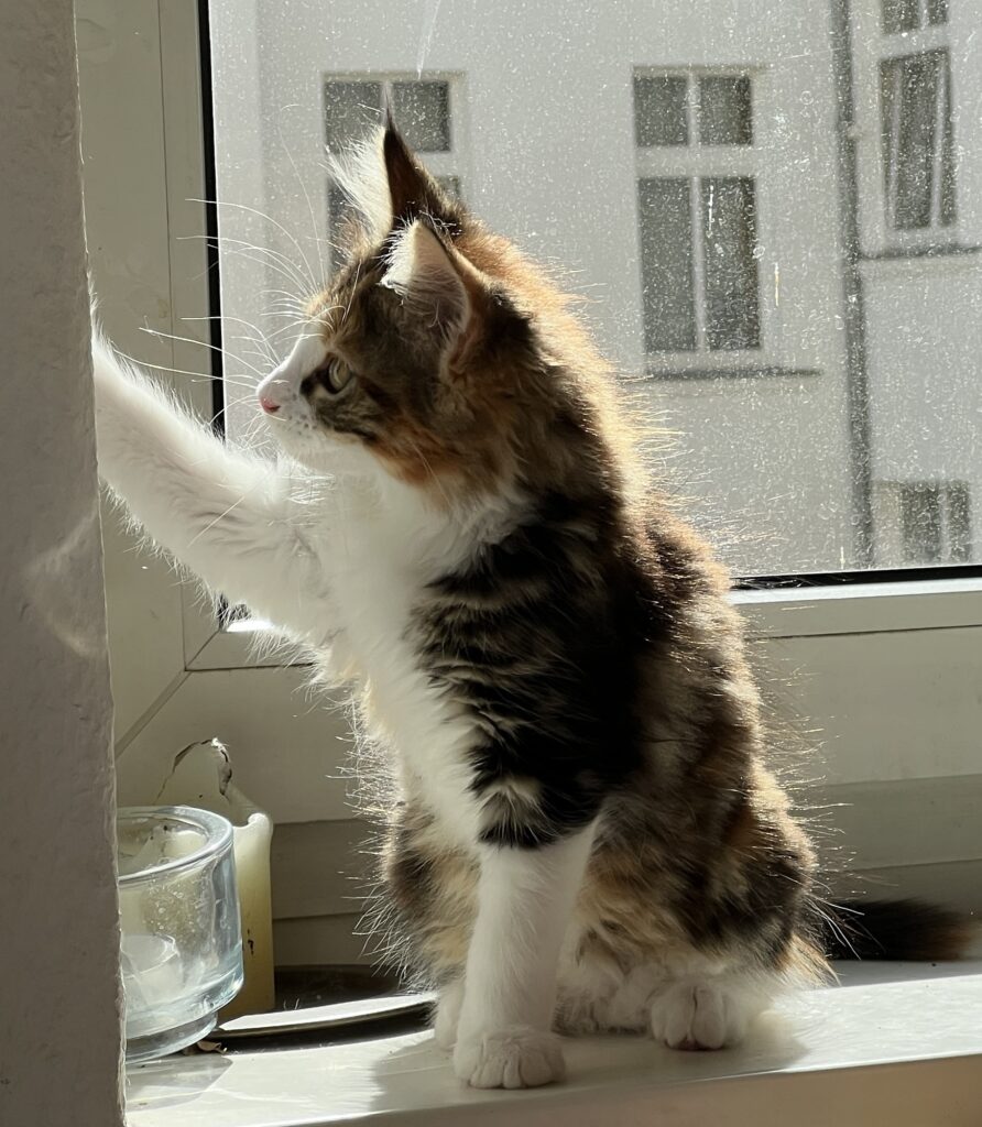 Es ist nicht das Schlechteste, einen Kompagnon zu haben. Jemand, der hinter einem herläuft. Einen anhimmelt. Nachahmt. Einfach da ist. Wie Baby Coco. Tatsächlich spüre ich Wärme in mir. Wenn sie zu mir auf den verbotenen Sessel – weil antik und so, you know? – kommt. Und mir tatsächlich Sicherheit gibt. Und sowas wie Stärke. Offenbar: Weil ich nicht allein bin.