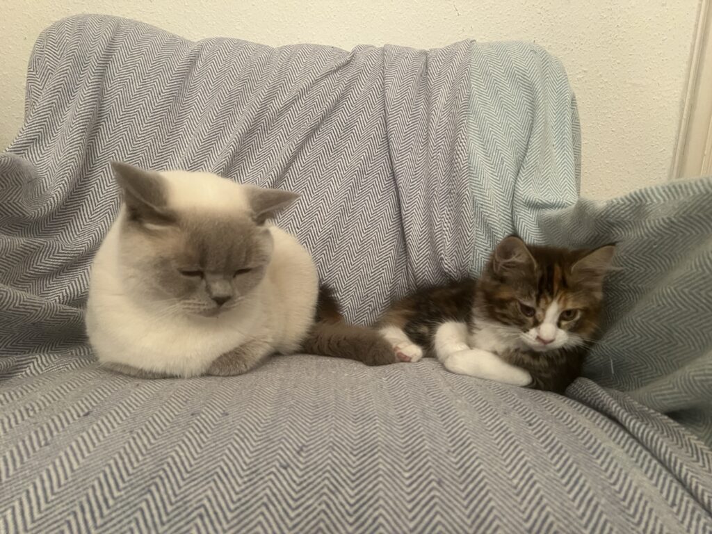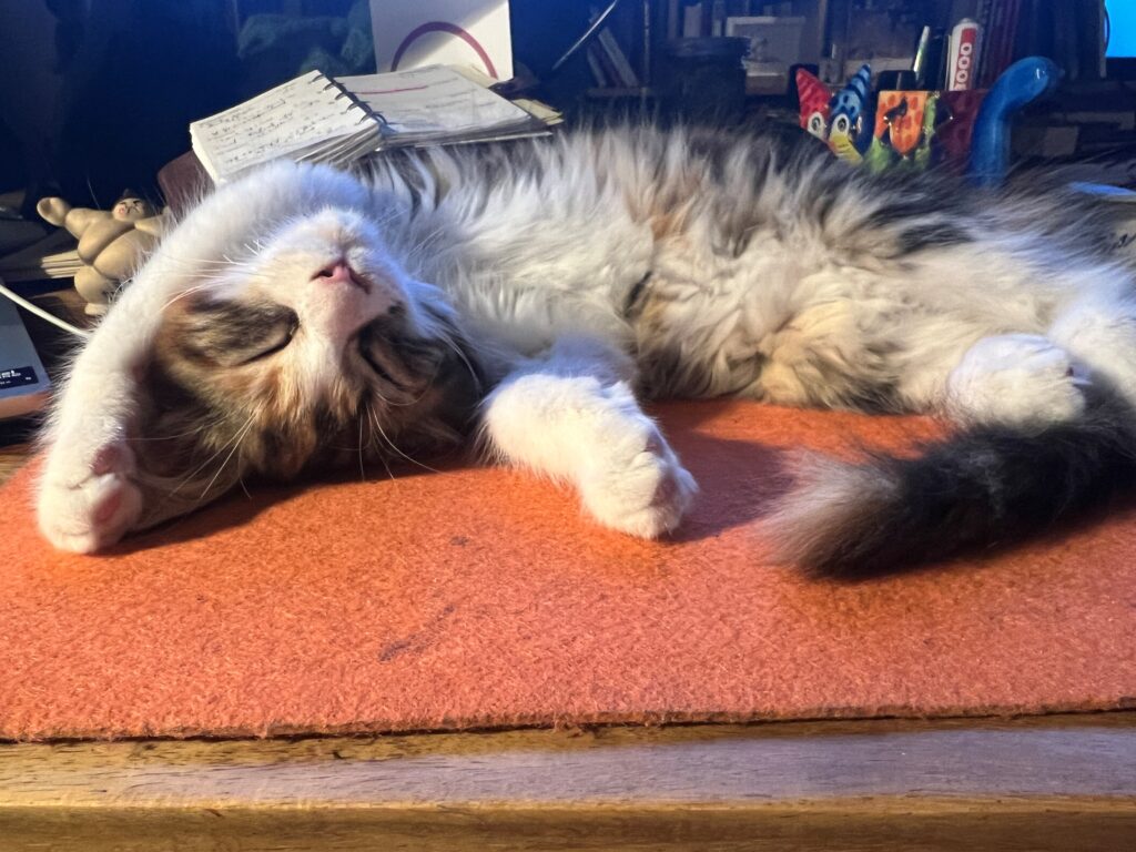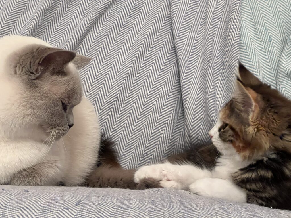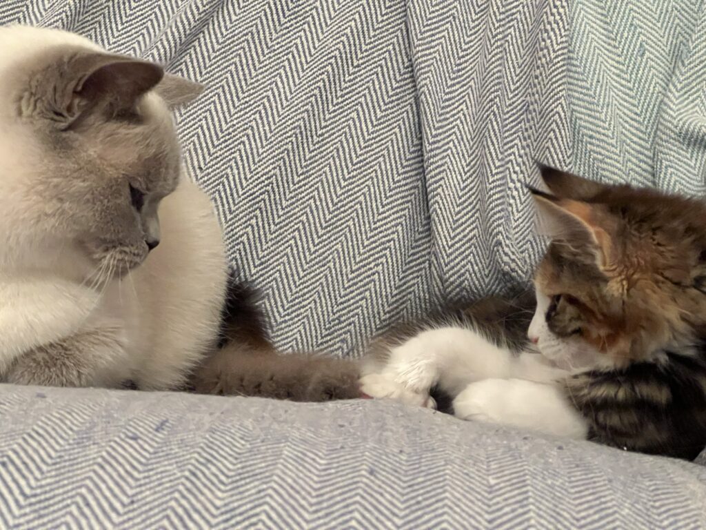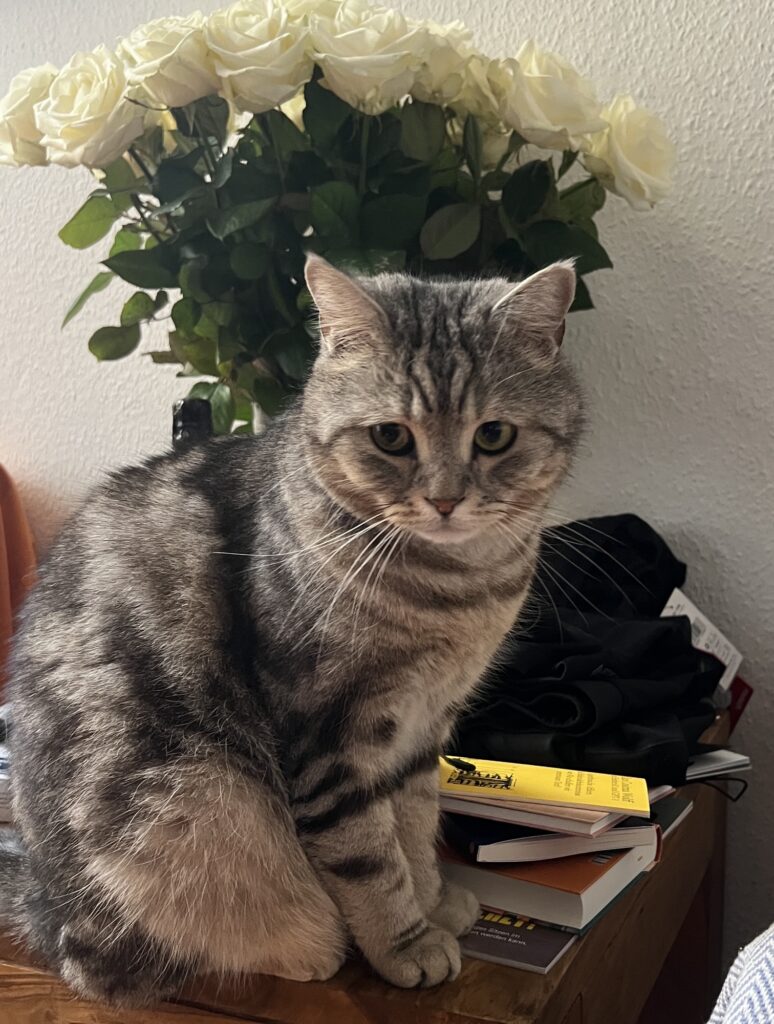 Und ich lecke. Und sie schnurrt. Ich bin eben Helfer. Ohne Kochsalz. Dafür mit Heil-Speichel. Und wir beide bleiben feist im Sessel liegen. Selbst als Felix an seinem geliebten Möbel mit ernstem Gesicht vorbeischreitet.