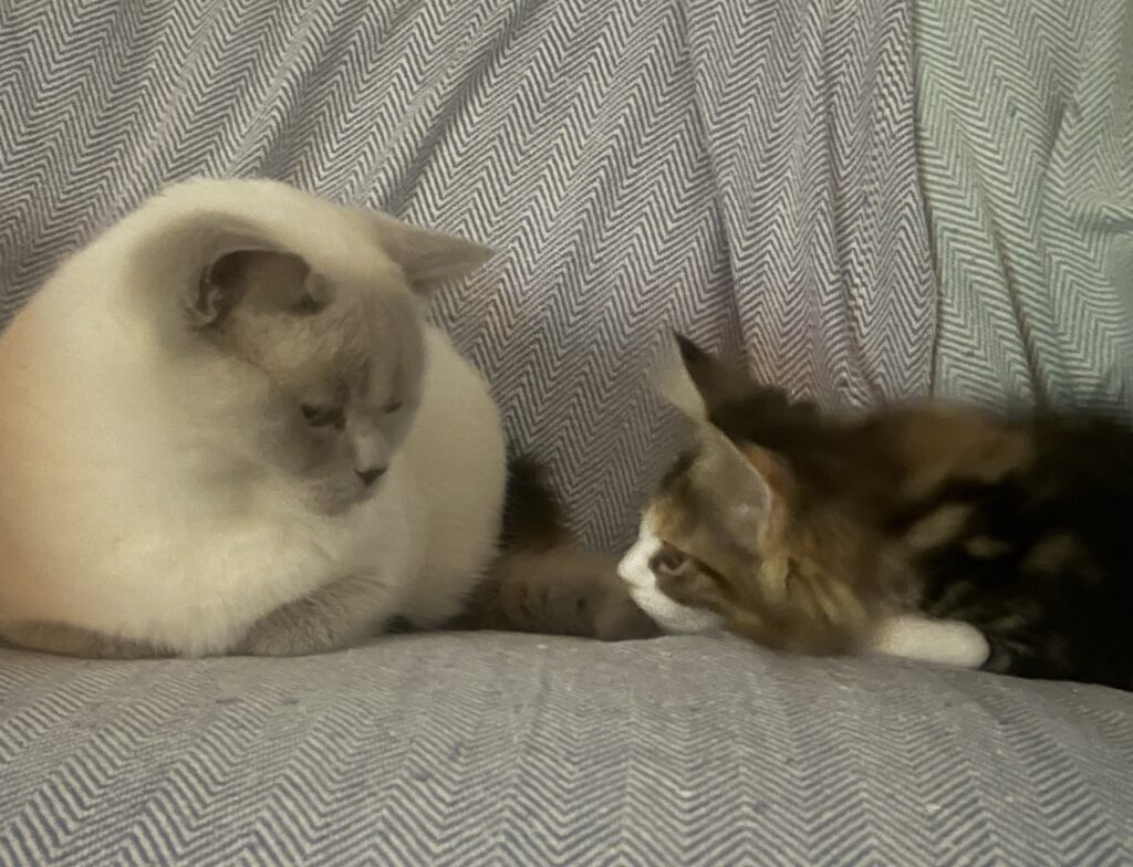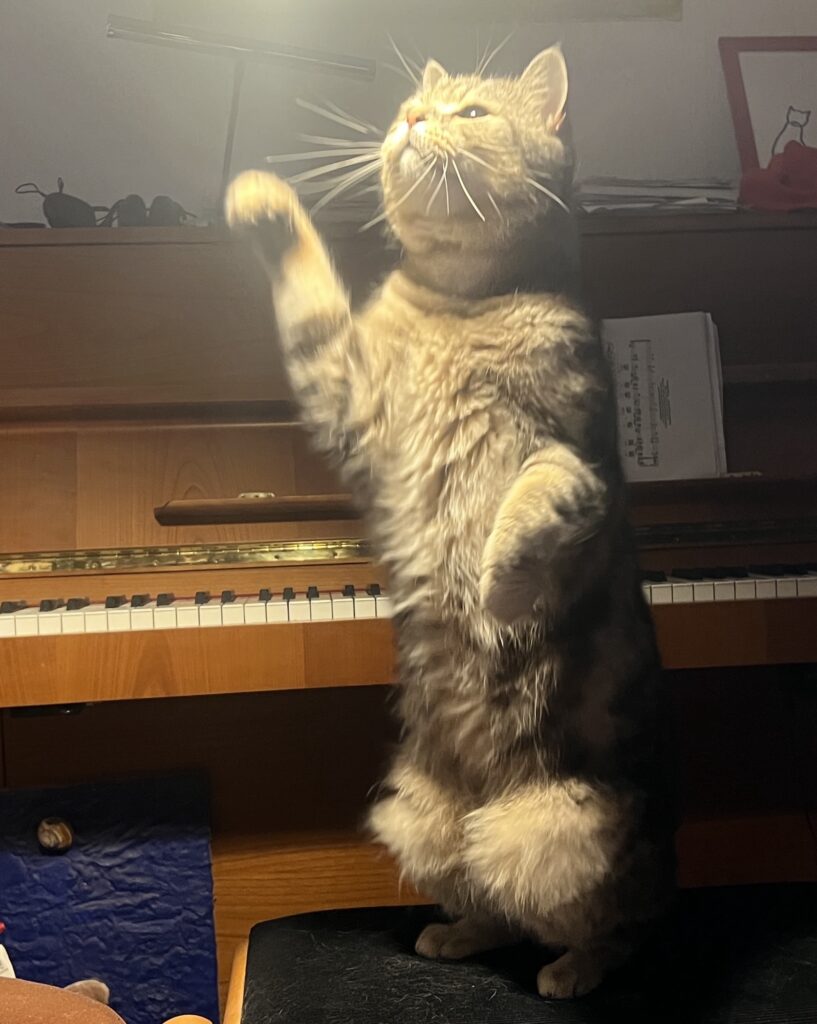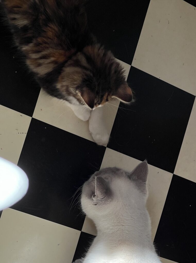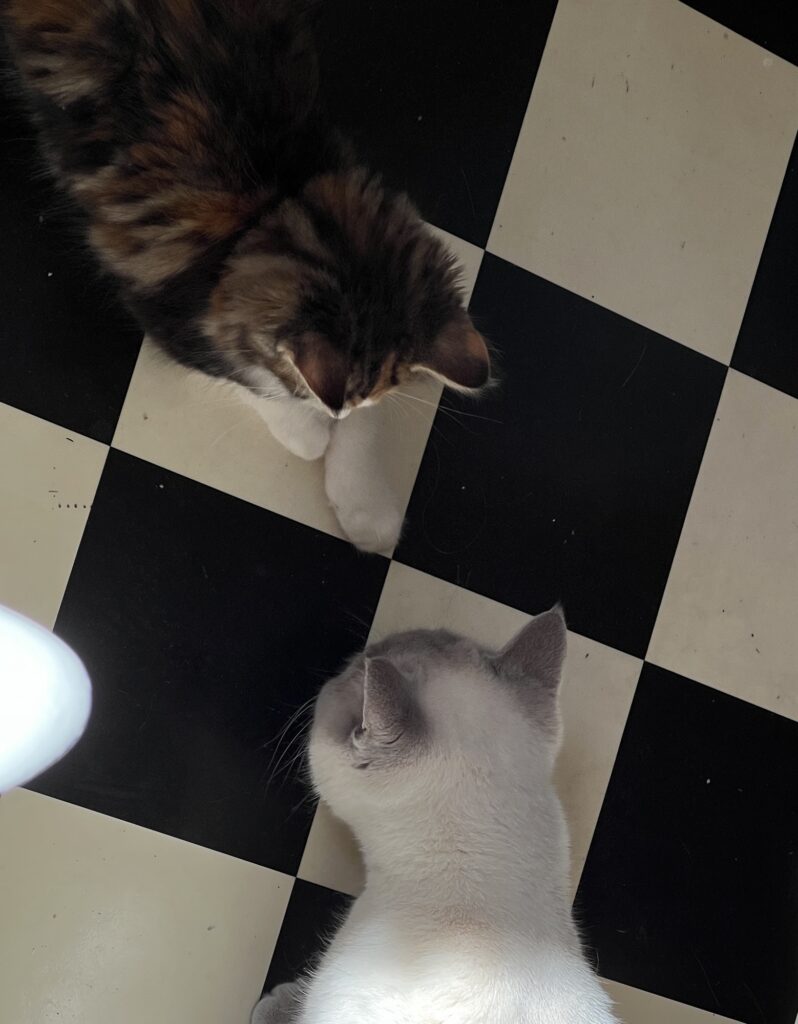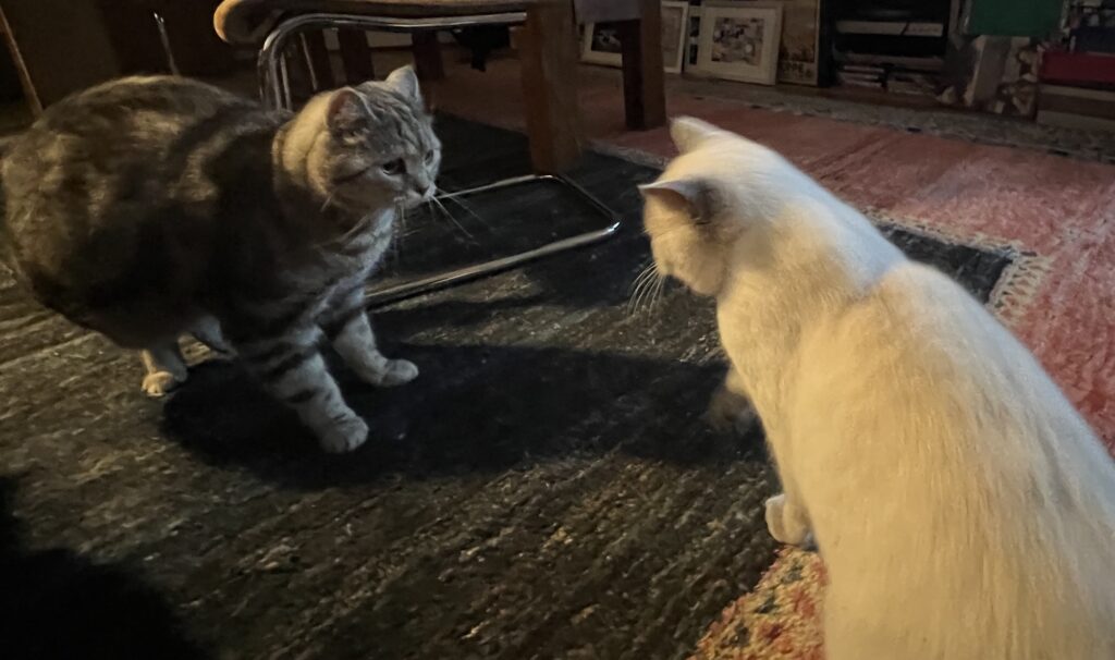 Wir bilden eine Phalanx, das so called Katzenbündnis Chaco. Felix traut sich nicht, uns zu verjagen. Weil wir zu zweit sind. Gemeinsam. Sind. Wir. Stark. Eben.