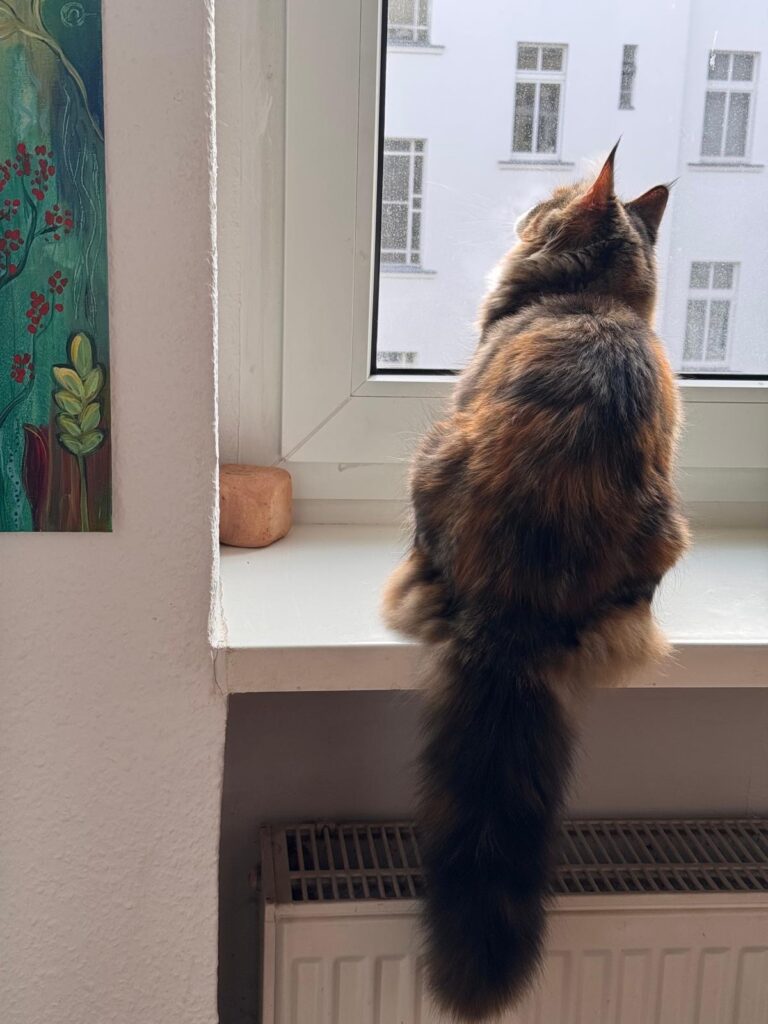 Und ich frage mich so, warum Menschen sich gegeneinander ausspielen. Im Großen, im Kleinen, überall. Und blicke zur Bücherwand: Durch die Coco schweift. Und den dort liegenden Staub der Jahrzehnte aufwirbelt. Ich niese. Sie niest. Felix asthmatiert.